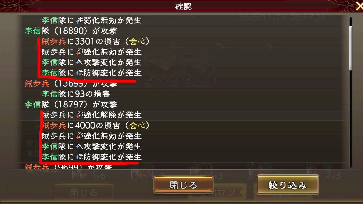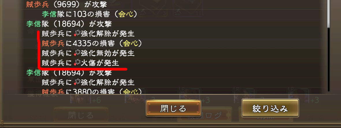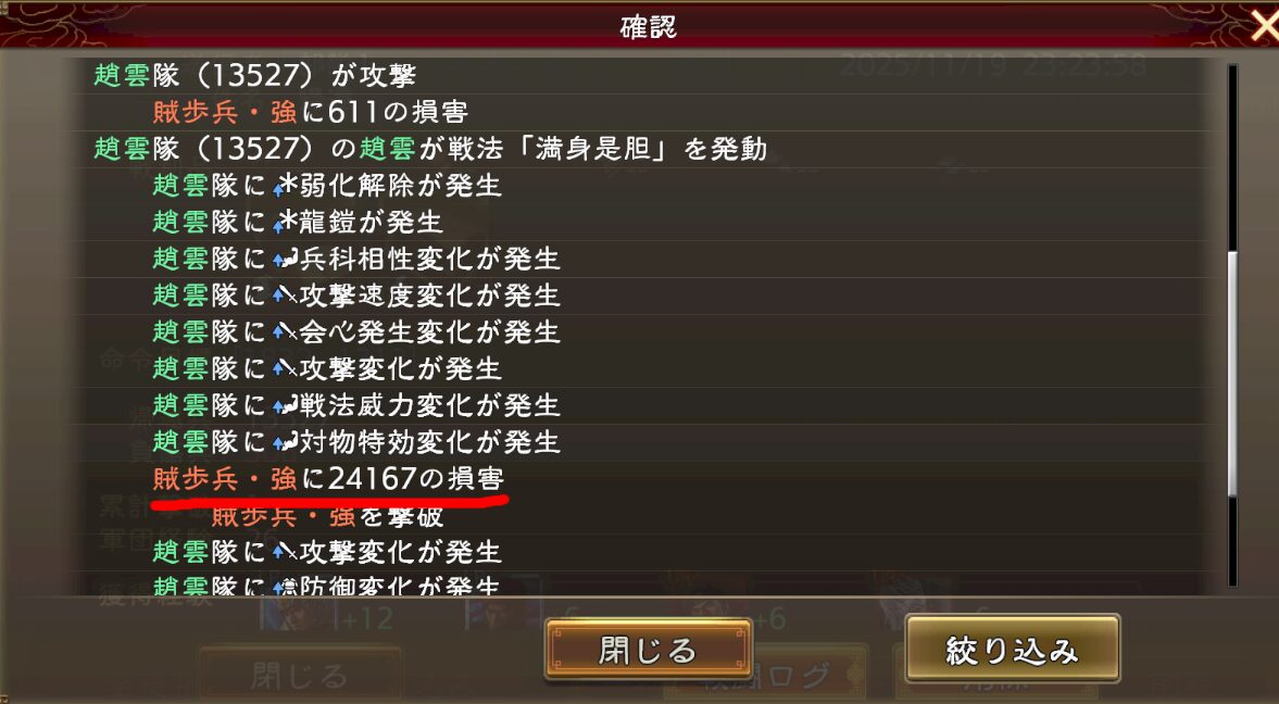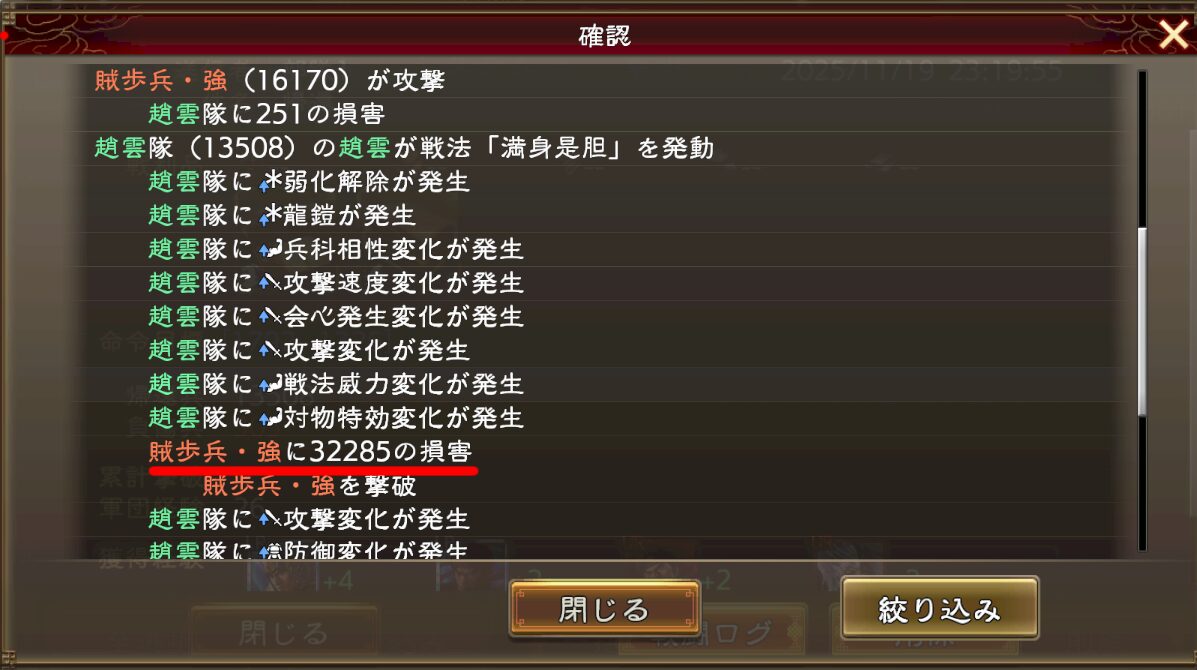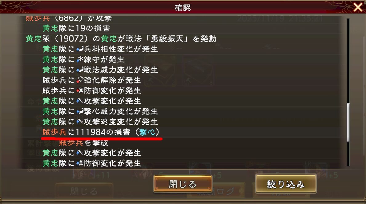 そして下のログでは弓兵で歩兵を殴ってる訳なので、与ダメ有利が付いてます(1.25倍程度)