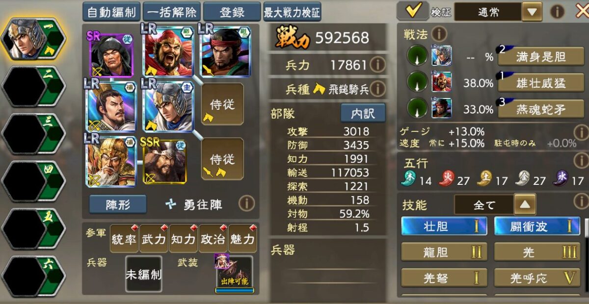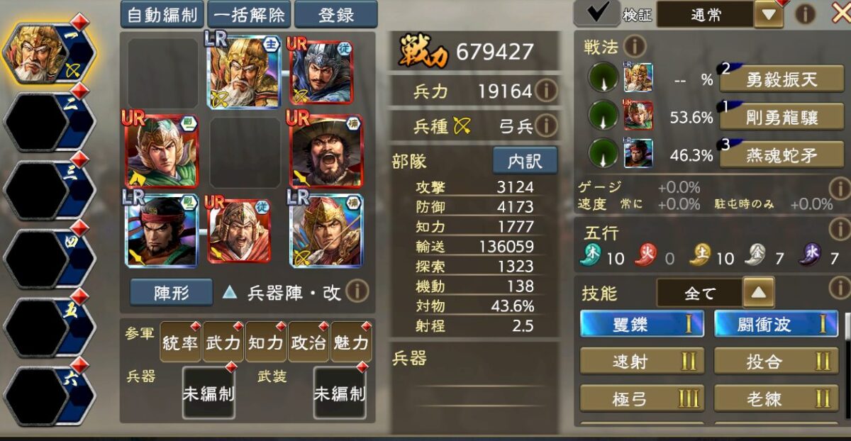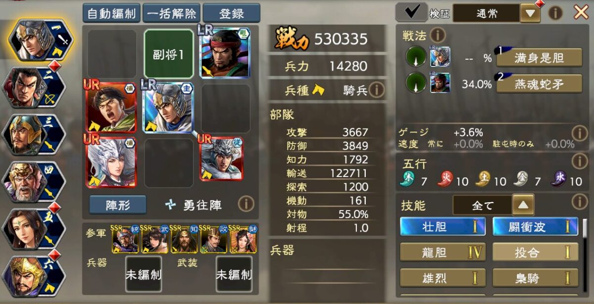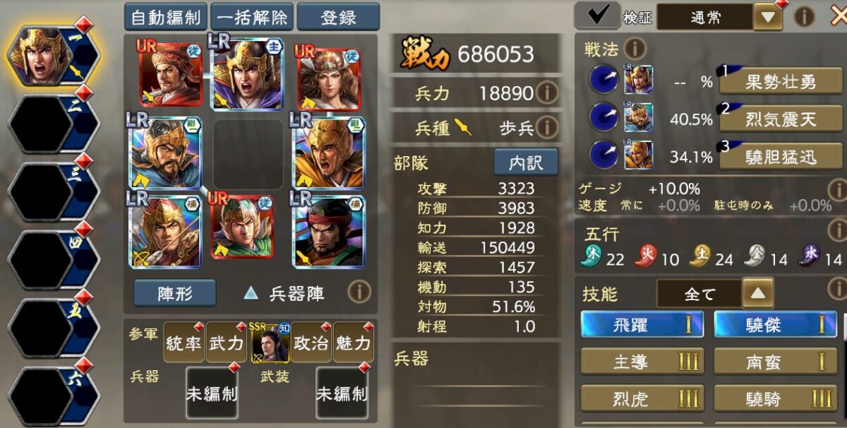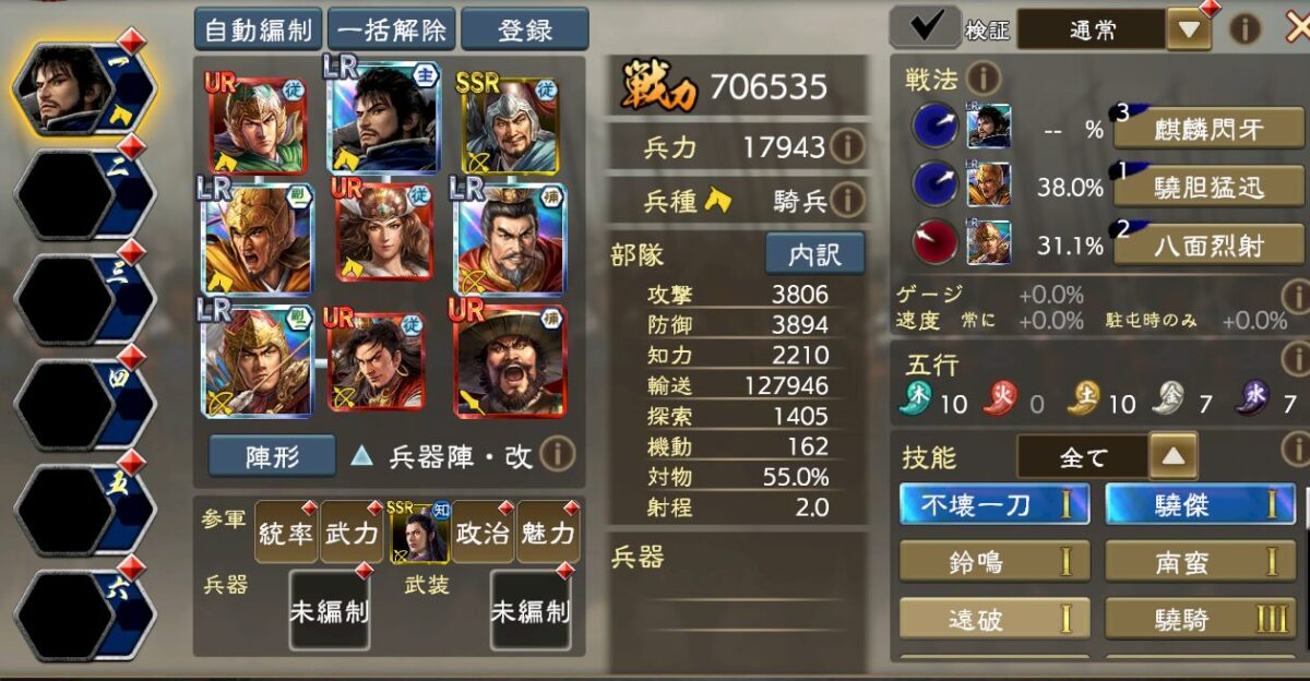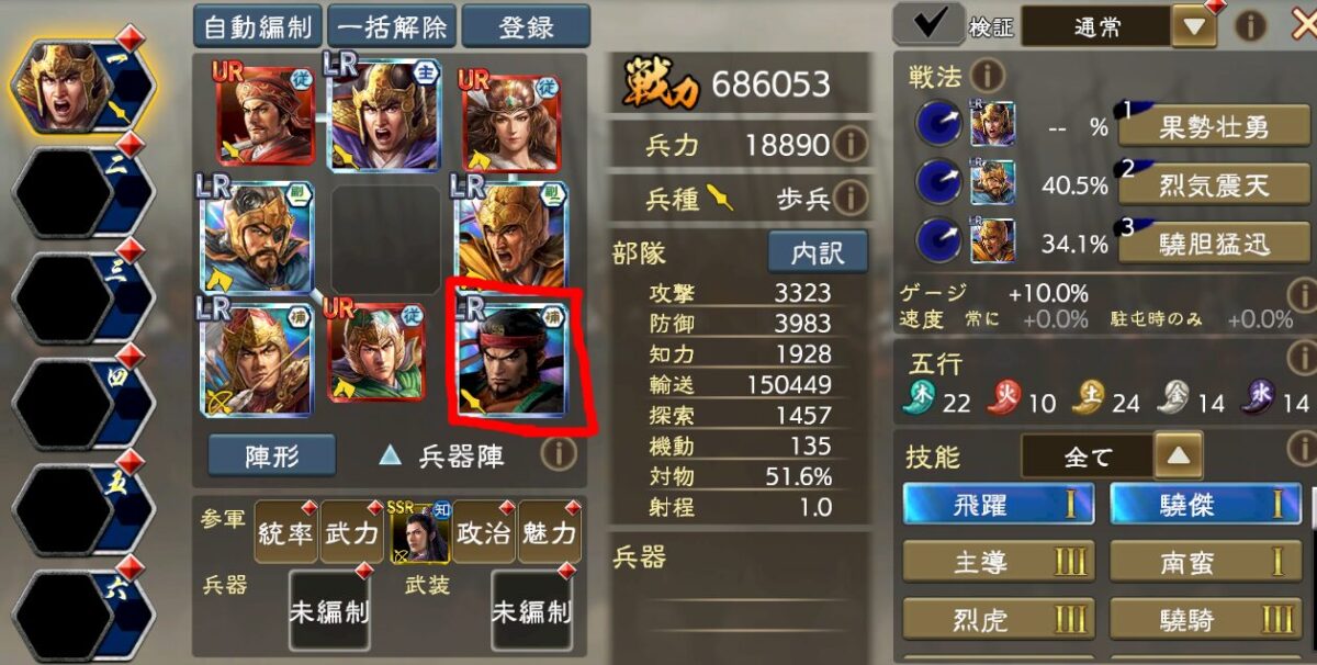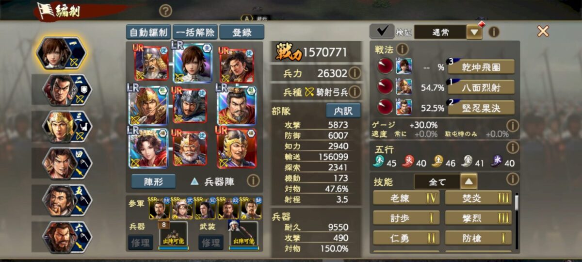 細かい編成理論は流石にアップできないのですが、要するに火属性強化5を入れつつ、UR夏侯淵の極弓3の与ダメ補正で歩兵を徹底的に叩ける編成です。