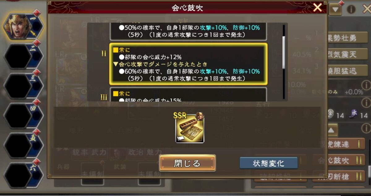 まあそんな感じなので、要するにオリジンズ張飛を強く使いたいなら交戦開始時の活身バフが必須だと思います。ぶっちゃけ交戦開始時の活身バフがないなら、UR廖化とかUR岳飛でええやろ感がある。特にUR廖化は技能が侍従じゃない方が強く、戦法が強いって割と珍しい特性も持ってるので使って行けるはずです。