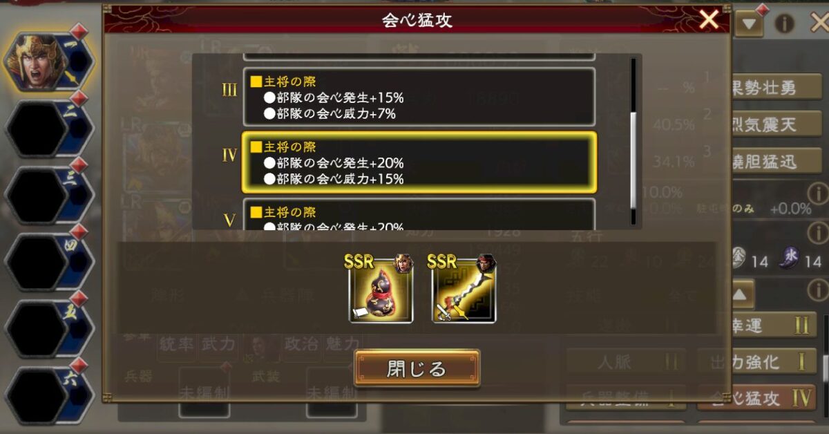 会心発生率ってかなり上げにくいのですが、これがあればかなり高くできます。LR楽進が居るならここから更に+30%されるので、これで会心発生率は+50%の状態まで盛れます。