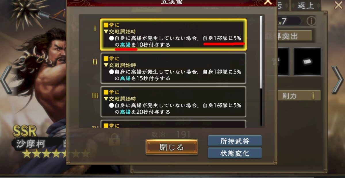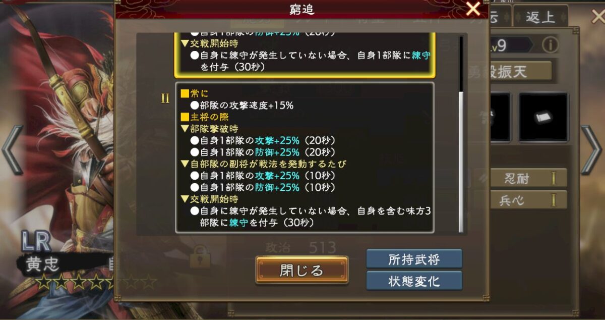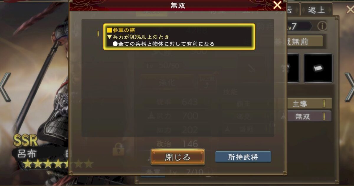 強いんですけど、誰が使っても無条件で強い武将じゃないので注意してください。あと戦法が遅いなのも注意。即死耐性とか敵部隊撃破時バフとか、この辺は普通に強いんですけどね。