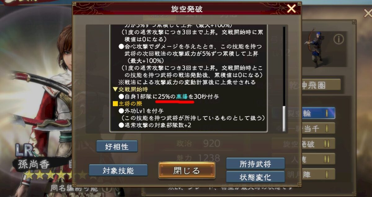 例えば孫尚香の25%高揚であるの場合、特定時間(これ系のはおそらく2秒更新)ごとに25%の攻撃バフが発生し続けているって感じになります。