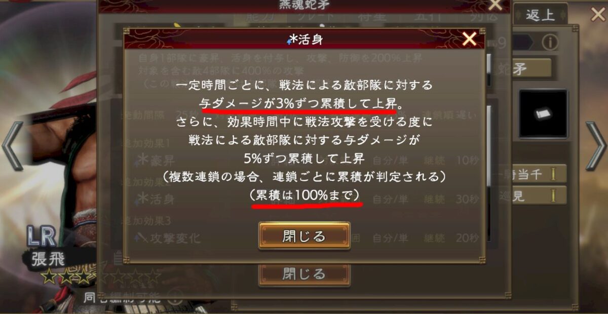 新機軸バフで被りが無いとは思うのですが、高揚バフは攻撃バフと累積上限が共通って特性を持っているので、もしかすると活身も戦法威力バフと累積上限が共通である可能性はあります(累積上限が100%ってのが非常に怪しい。戦法威力のバフ上限も100%)