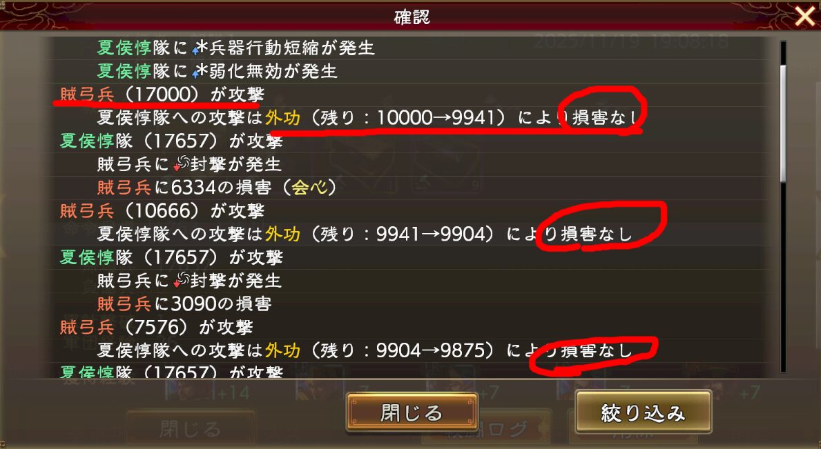 言われて気づいたんですけど、外功って外功が消えるまで部隊に対して被害(ダメージ)がないんですよね。被害が無いので、当然ですが兵力も減りません。