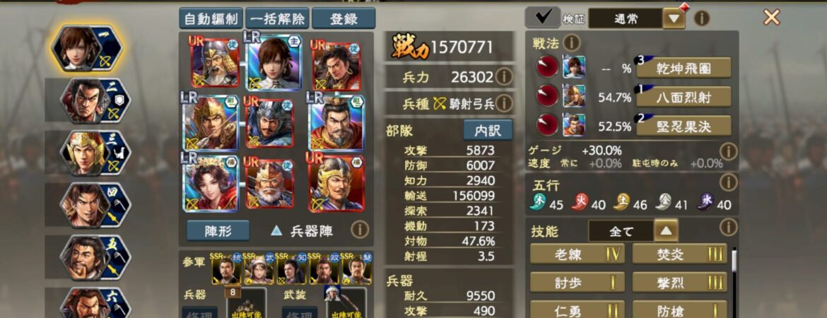 細かい編成理論は流石にアップできないのですが、要するに火属性強化5を入れつつ、UR夏侯淵の極弓3の与ダメ補正で歩兵を徹底的に叩ける編成です。