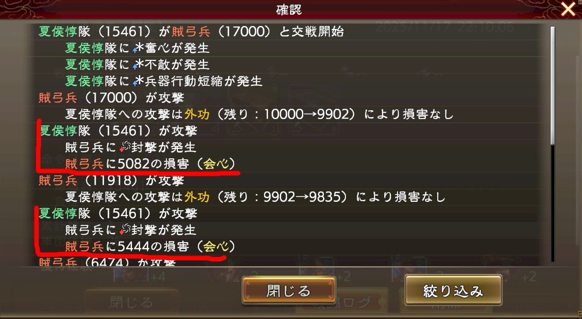 夏侯惇が完凸まで行ってれば、交戦開始時強兵(MAX25%)があるのでダメージも一気に化けてくるとは思います。