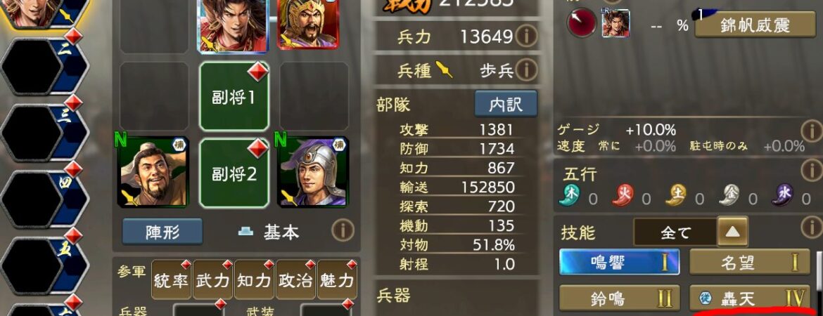 UR鄒氏が実装。地味に結構強力な技能と戦法を備えている感じです。4部隊幻惑ってのが結構強いのと、技能が星を参照にして性能アップな感じ。もしかすると、LRの育成状況次第では侍従ではなく、直接運用が必須になる可能性もある。