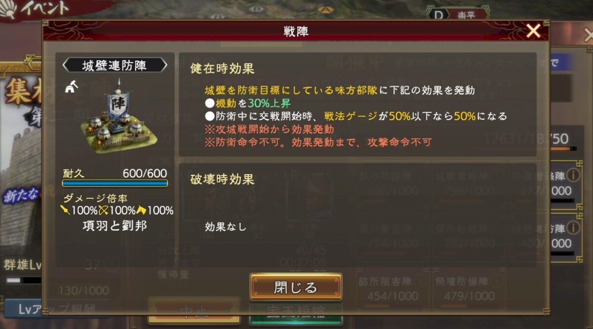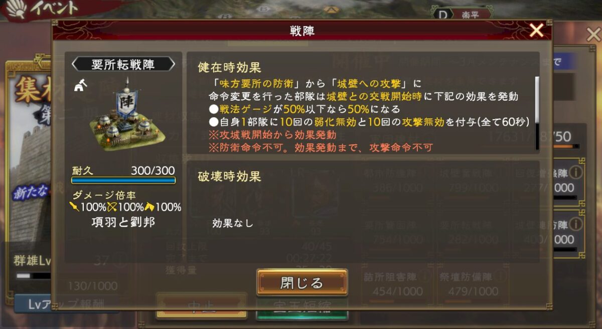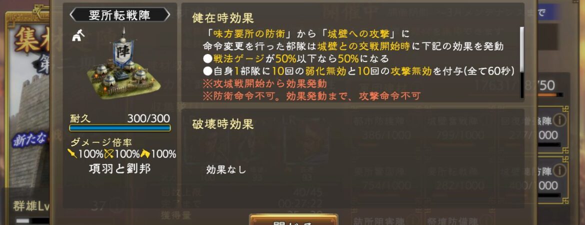 こっちは攻めで使うような陣なのですが、味方の要所(攻撃側で落とした要所)から、城壁への攻撃(敵が守ってる本丸)への攻撃の際、戦法ゲージが50%増加するんですよ。しかも、弱化無効や攻撃無効のおまけまでついて。