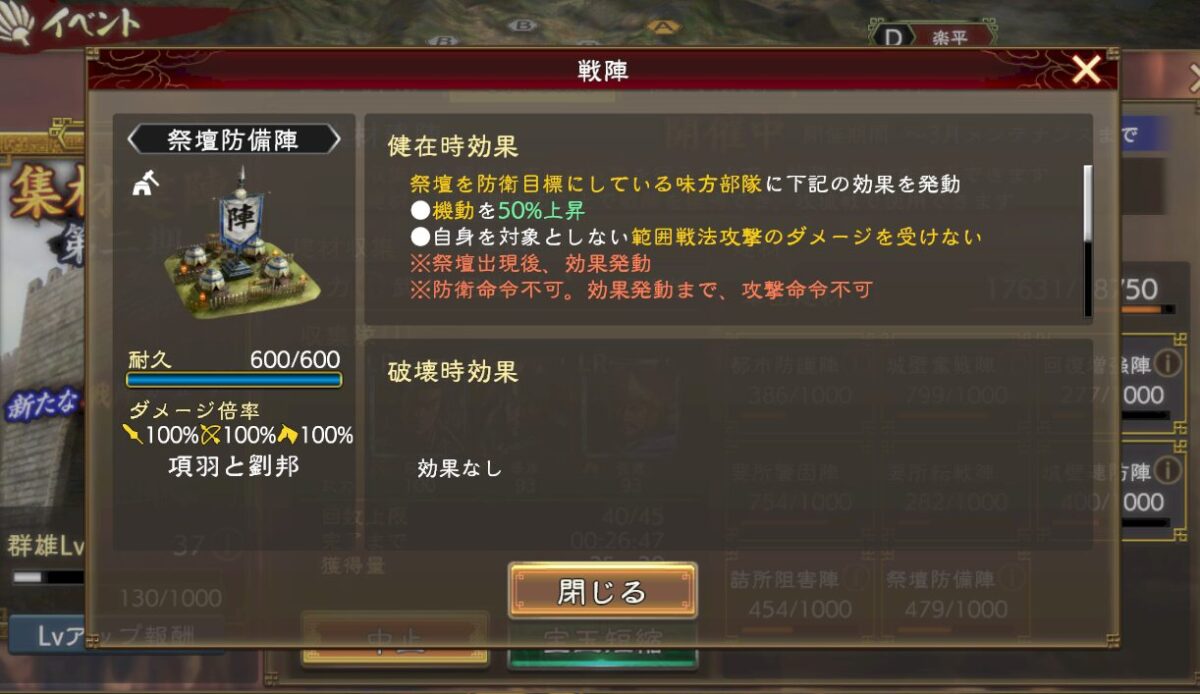 でも耐久が300と他の陣に比べて壊れやすく設定されており、そこでバランスを取っているのは間違いないです。