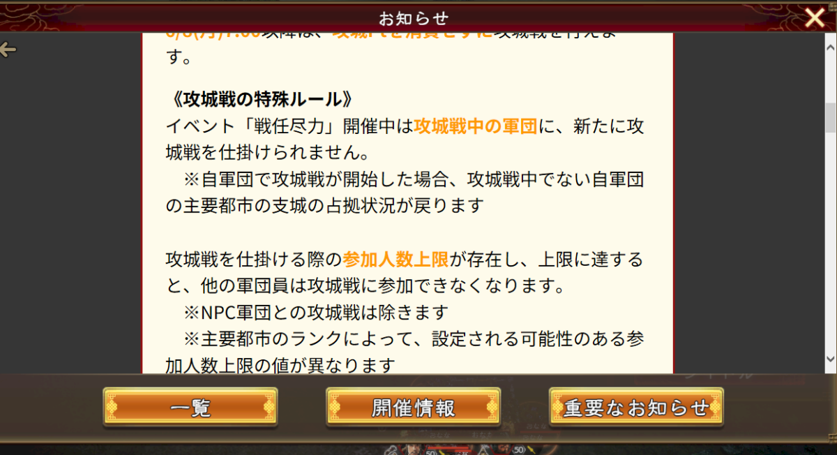 まずこんな感じで、「攻城戦を仕掛ける際の参加人数上限が存在し」と書かれていたので、筆者は「防衛側には参加人数が存在しない」だと考えていました。