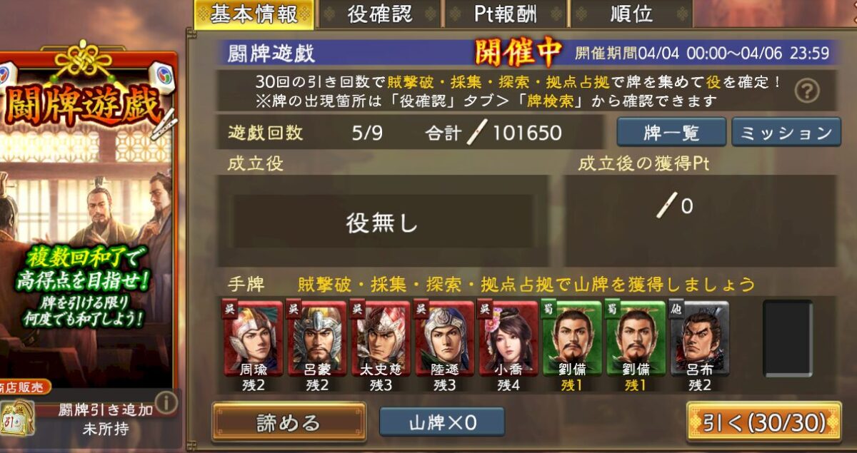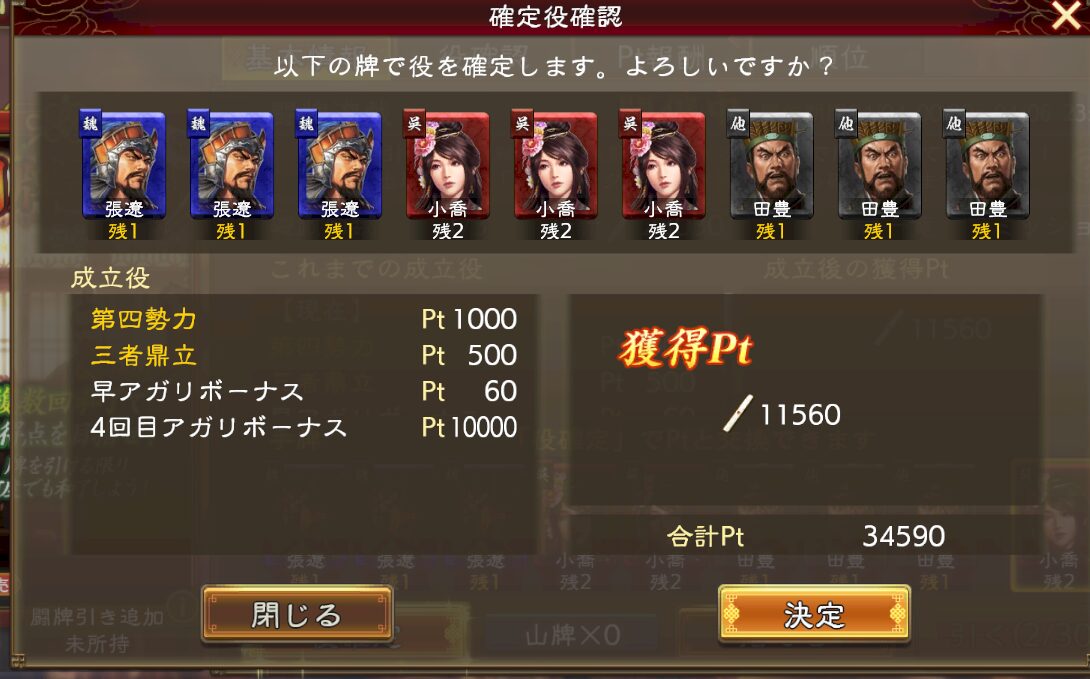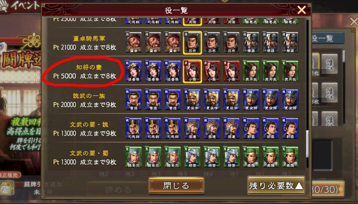 そうなってくると獲得ポイントは1万~2万。残り回数次第で1回は「知将の妻」を混ぜられると考えるならここに+0.5万。