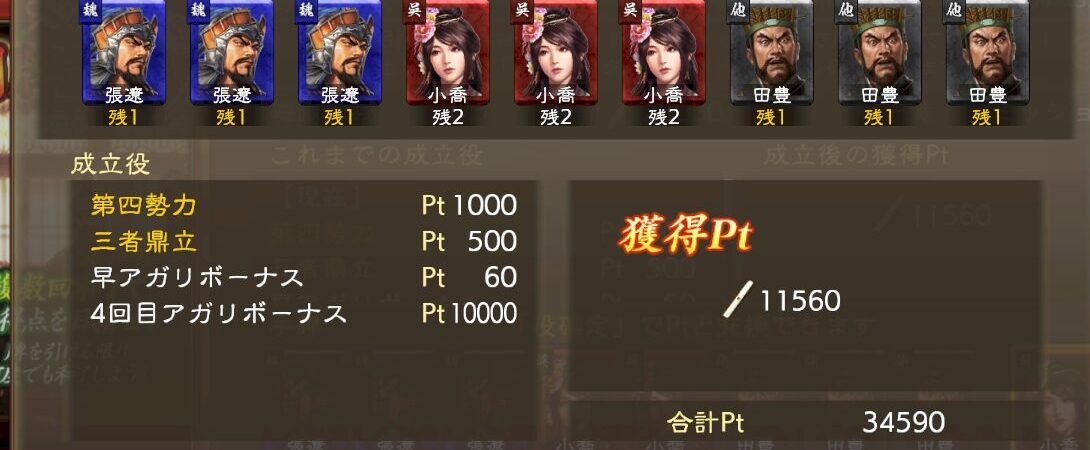 そうなってくると獲得ポイントは1万~2万。残り回数次第で1回は「知将の妻」を混ぜられると考えるならここに+0.5万。