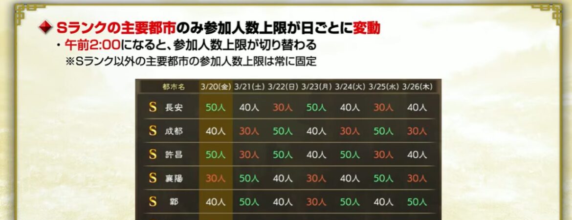 今季まではB都市以上、C都市以下、で攻城可能条件が分かれていました。来季はA都市以上、B都市以下、で分かれます。これは確定。