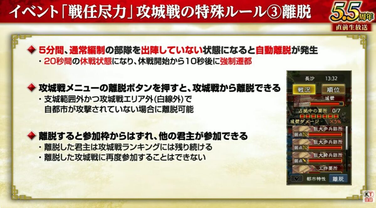 攻城戦未参加者、離脱者は、攻城戦関連の対象以外に出陣可能。