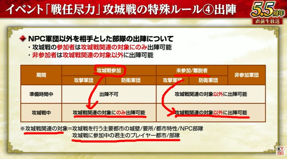 攻城戦参加者は、攻城戦関連の対象にのみ出陣可能。