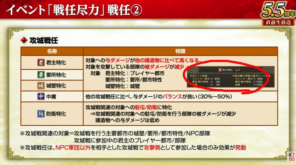 君主特化、要所特化、城壁特化、中庸、防衛特化で専任プレイヤーに補正がかかります。