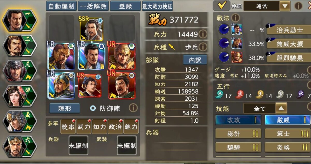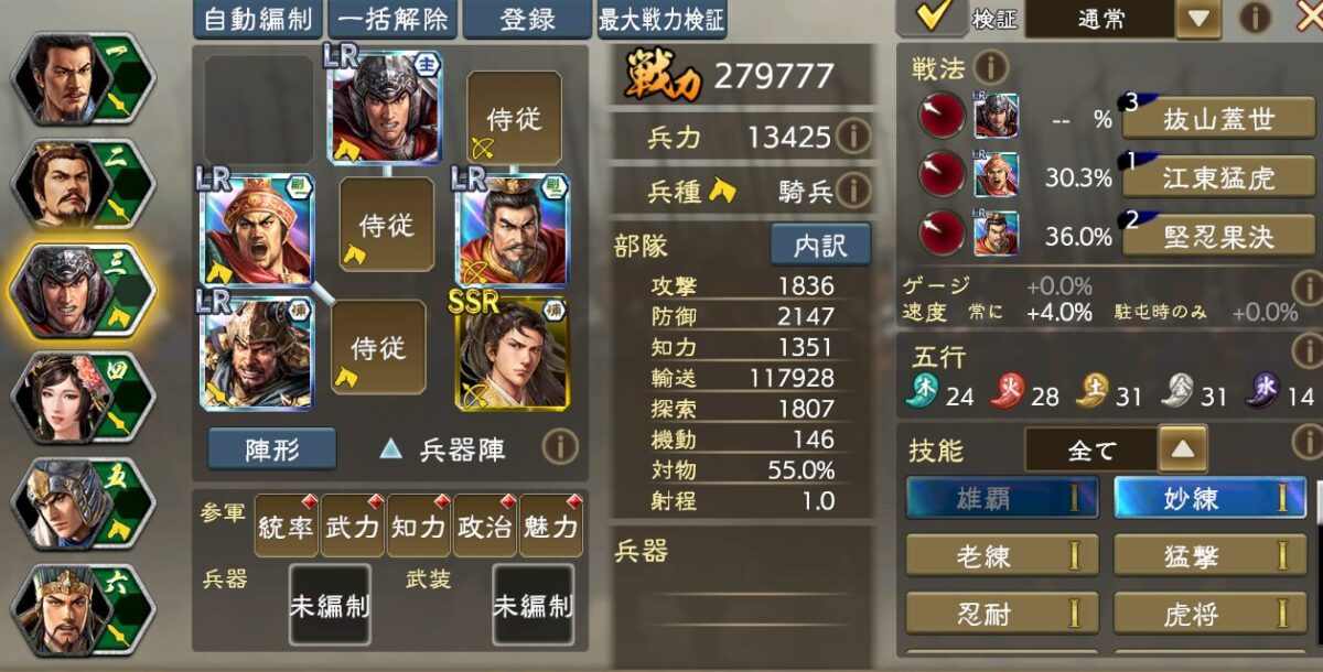 部隊ステータスの向上に主眼を置いているので、非常に汎用的な軍馬編成になってます。新しい武将が出ても、あるいは部隊ステータスが低いライト層でも、ある程度は編成の自由度を許容してくれるんじゃないか、とは想定しています。