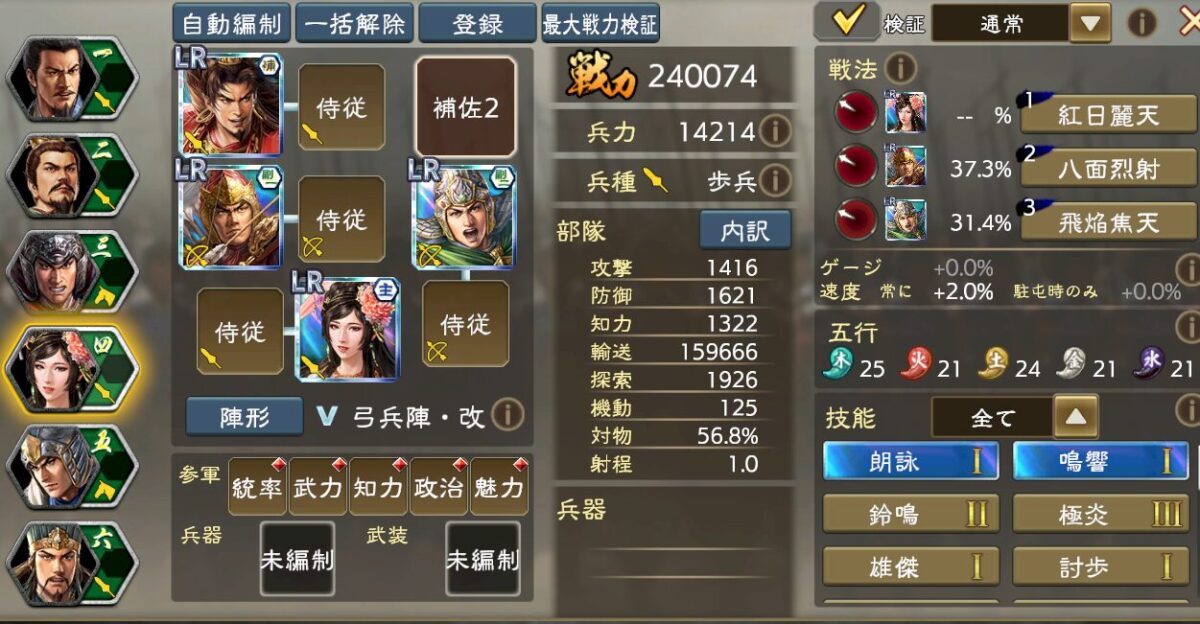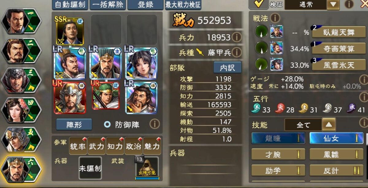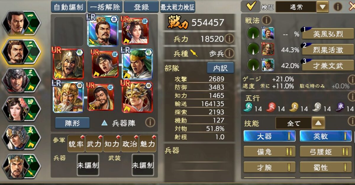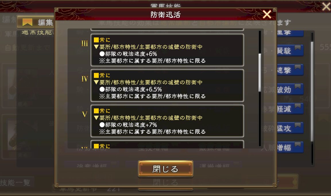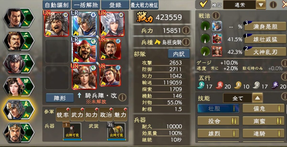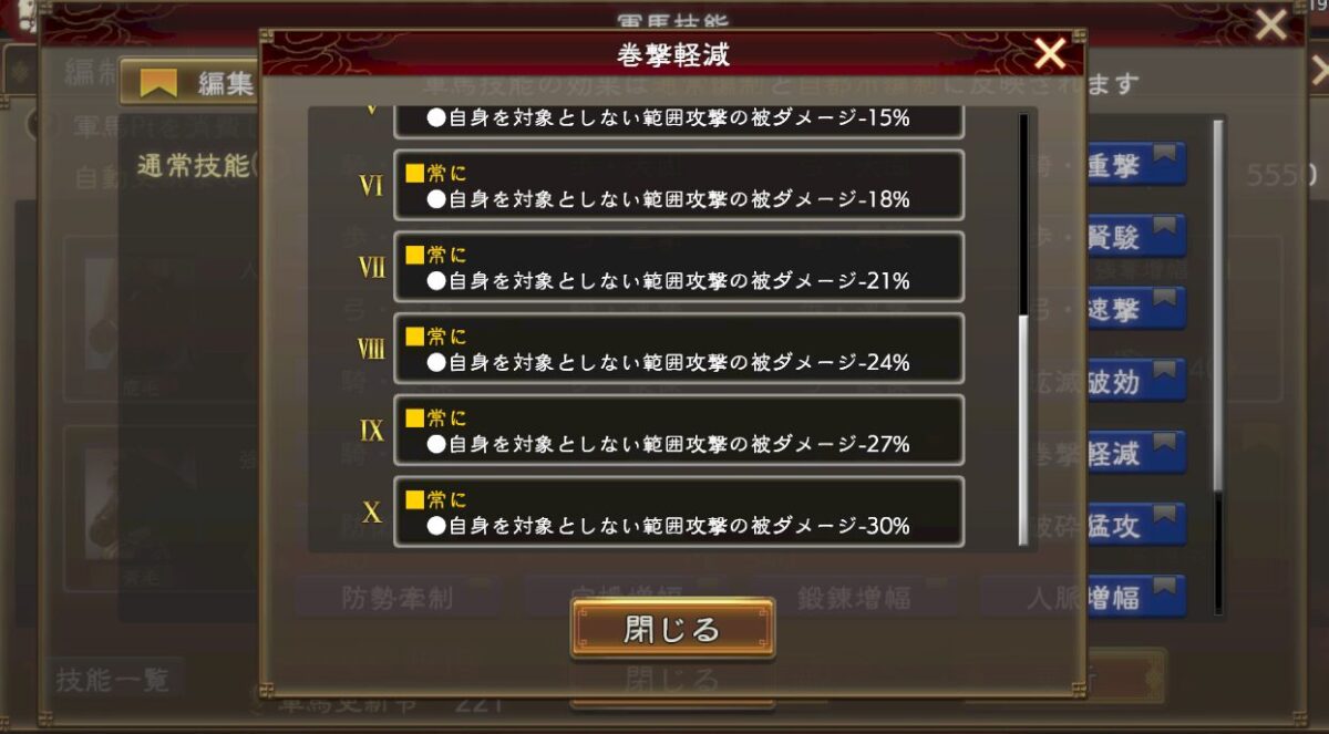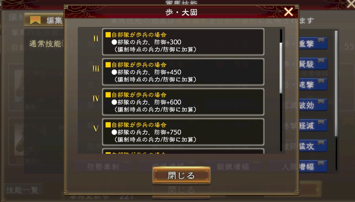 人によると「歩・重撃」が不要な筈なので、「歩・緩衝」と「騎・緩衝」を組み込みつつ「巻撃軽減」を技能レベル5で組み込む方が部隊戦闘能力は向上する筈です。