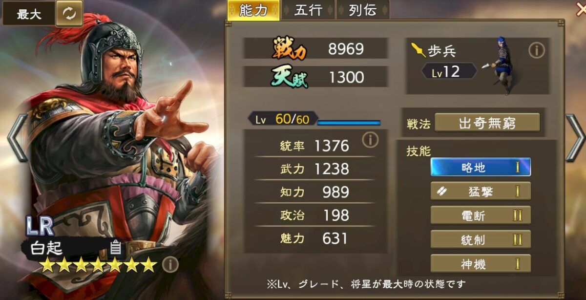 例えばですが、LR項籍(以下、項羽で記載)が登場するまでの、元祖救済武将である白起は武力型の方が収まりが良いです(一応、知力型にもできるっちゃできます。やる意味はありませんが)