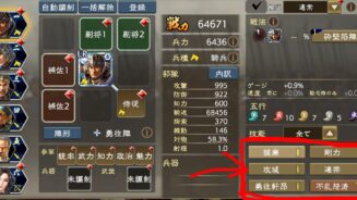 そして部隊を相性一致で揃えるという事は、武将の育成状況や確保状態を問われるのは当然として、編成が縛られるという事でもあります。兵科一致さえしていれば兵力確保が出来るのだが、兵科一致+相性一致がなければ兵力確保とステータス確保が両立できない。